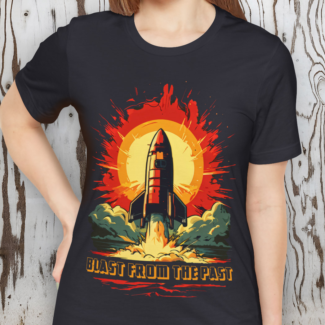 Launch your look with the Blast From The Past T-shirt, featuring a bold retro-style rocket blasting skyward through clouds of smoke. Set against a vivid orangey-red sun and grunge-textured background, the design captures vintage sci-fi energy with modern edge. The phrase “Blast From The Past” anchors the artwork, making this tee a standout for fans of retro futurism, space exploration, and graphic streetwear.