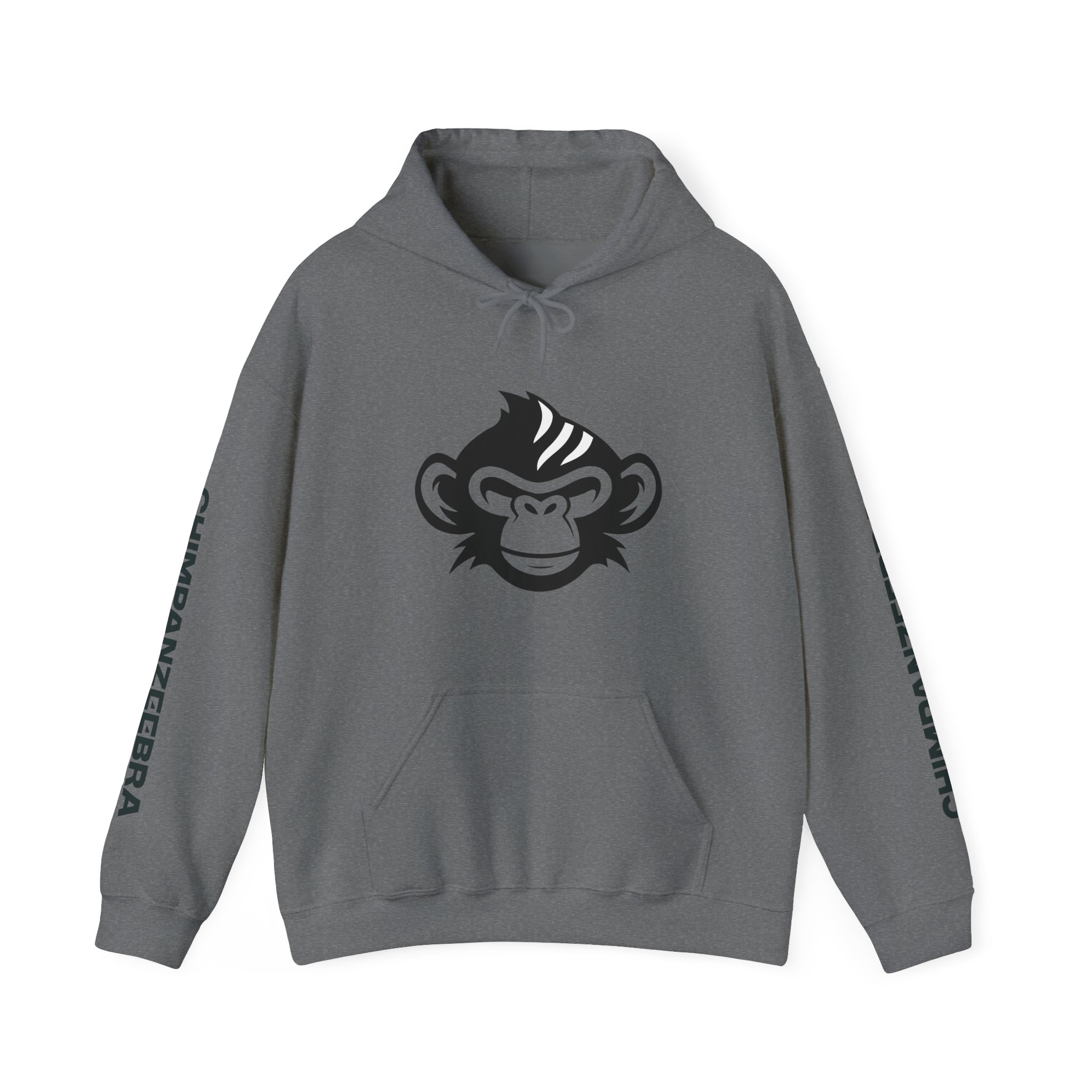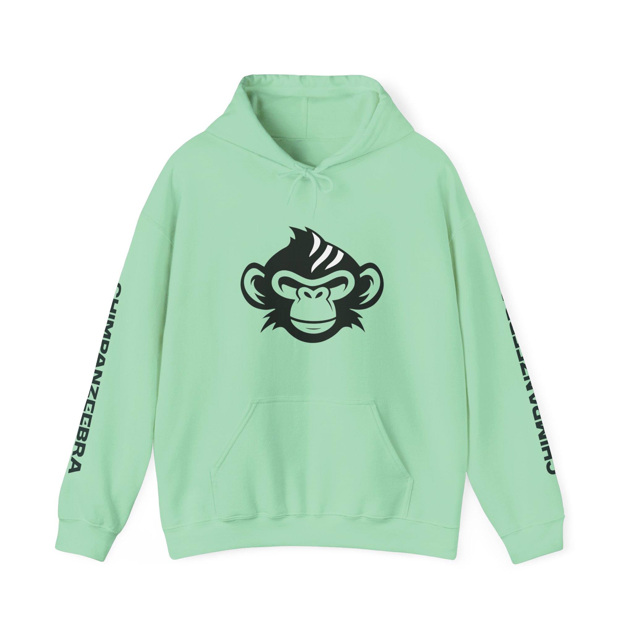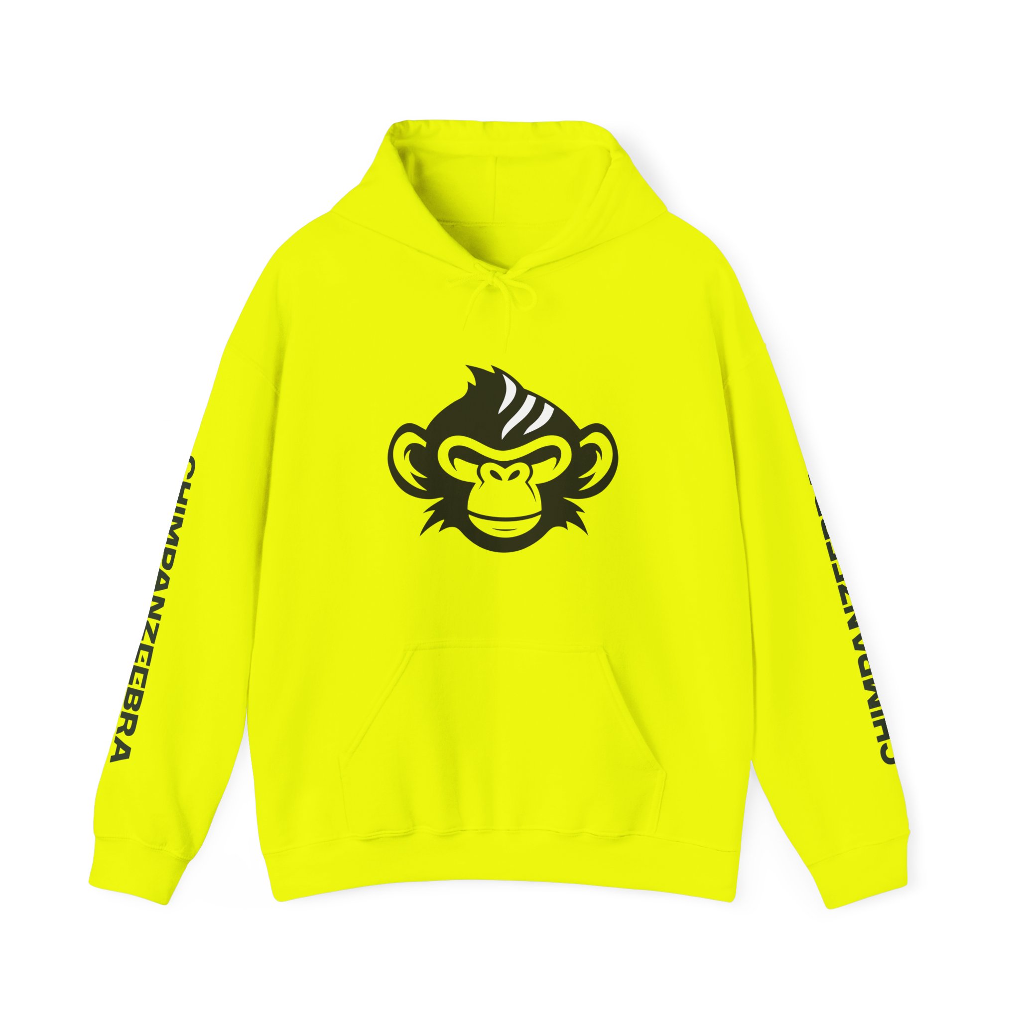Step into the wild with the Chimpanzeebra Hoodie, featuring a bold illustration of a black chimpanzee’s head marked by three sharp white stripes—an imaginative hybrid of chimpanzee and zebra. This surreal crossbreed design blends primal instinct with visual intrigue, perfect for fans of animal mashups, alternative fashion, and genre-defying streetwear. Each sleeve is printed vertically with “CHIMPANZEEBRA” in black, adding a distinctive branded detail that reinforces the hoodie’s unique identity.