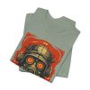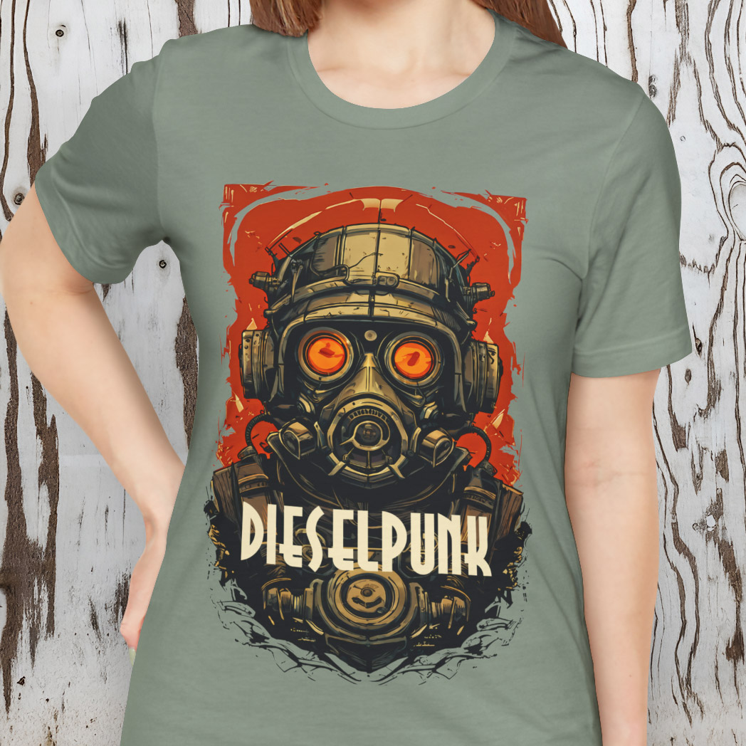 Step into a world of retro-futuristic rebellion with the Dieselpunk T-Shirt. This bold graphic tee features a striking head-and-shoulders portrait of a dieselpunk figure clad in a metallic helmet, industrial mask, and rugged gear. The orange goggles pierce through a gritty red grunge background, evoking the raw energy of wartime machinery and underground resistance. Across the lower portion of the illustration, white text reads “Dieselpunk,” anchoring the design with unapologetic attitude.