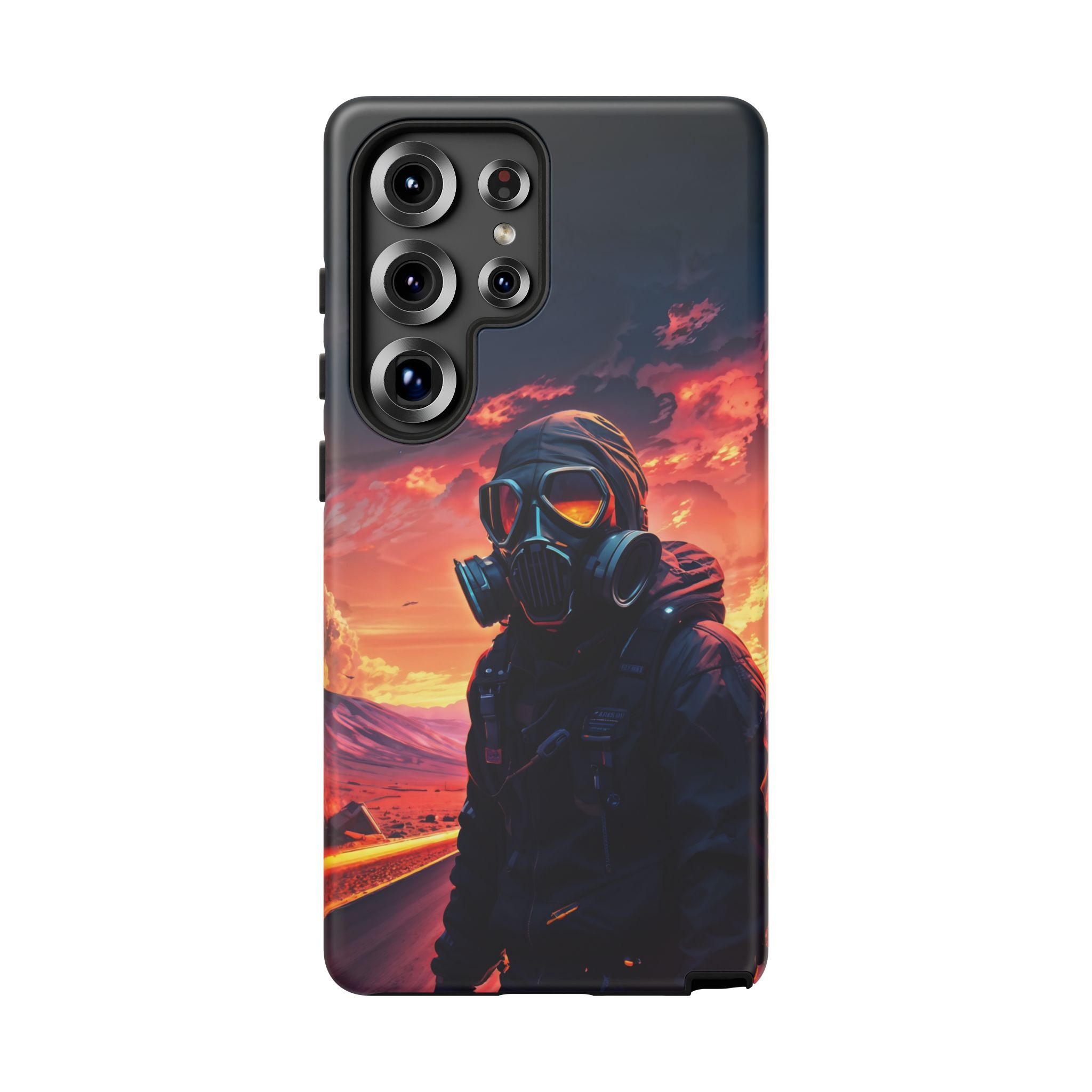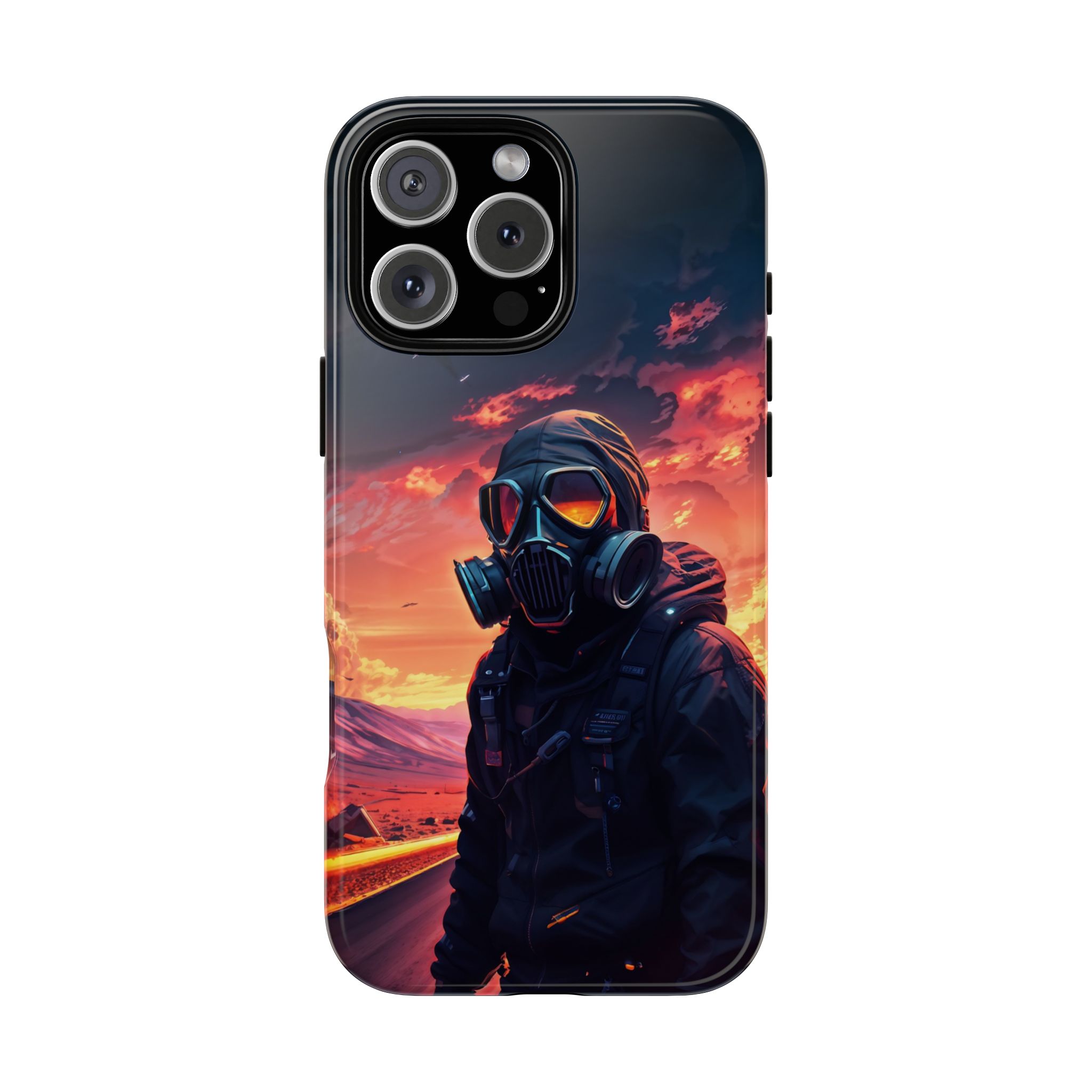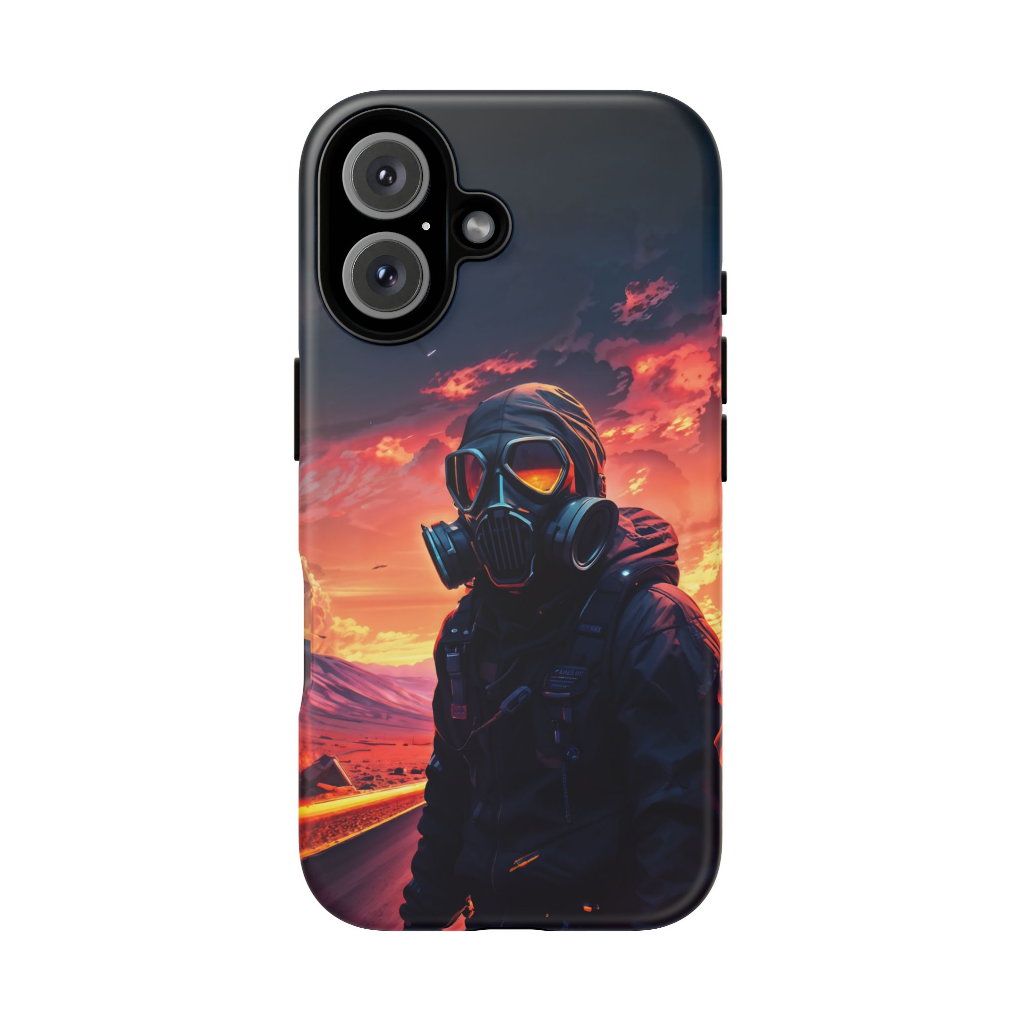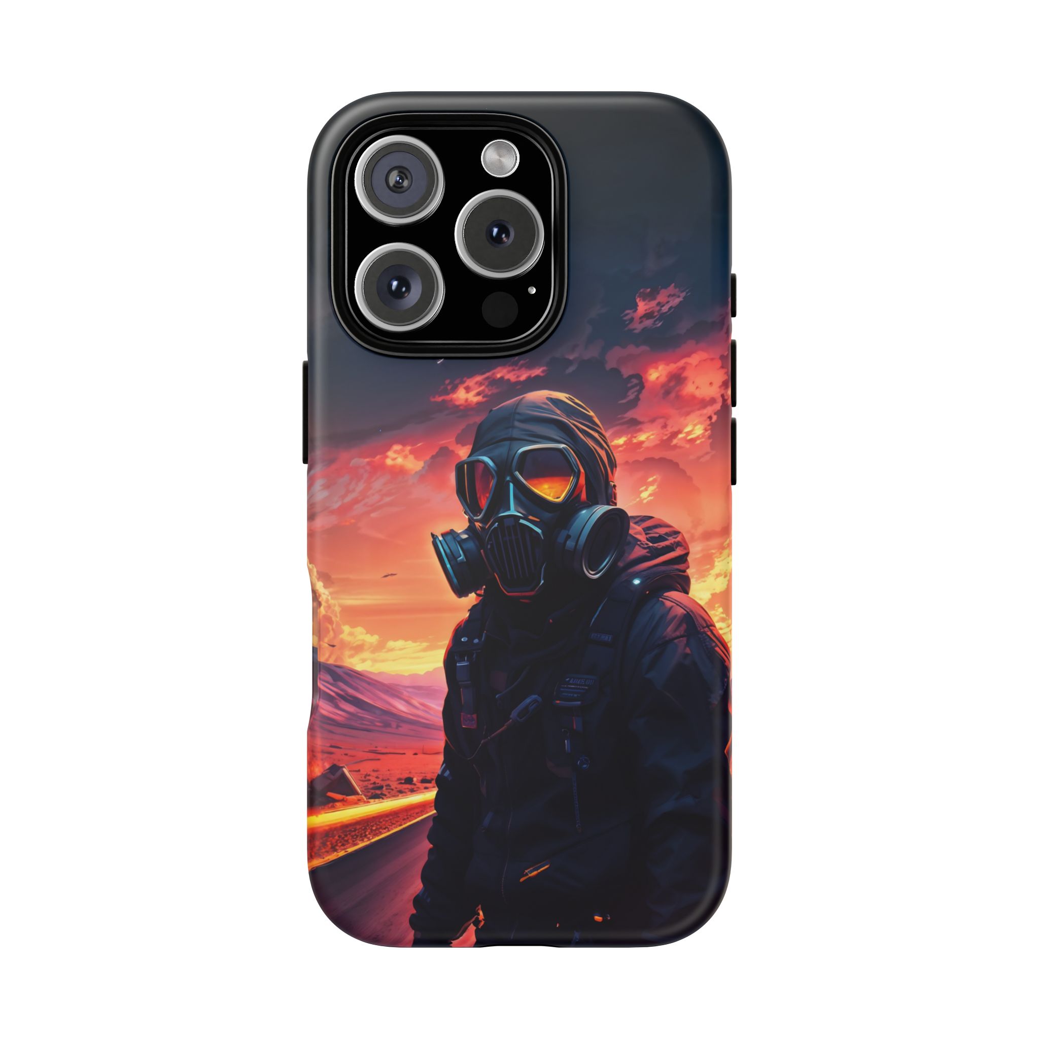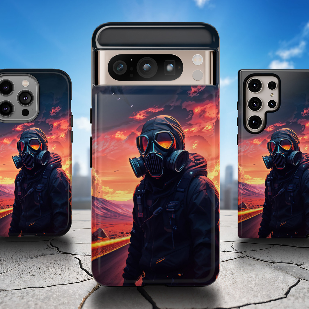 Prepare your device for the apocalypse—this rugged phone case merges high-impact protection with a hauntingly cinematic design. Featuring a lone survivor in a tactical exo-suit and futuristic gas mask, the artwork captures a moment of defiance on a scorched highway beneath a burning sky. Shades of molten orange, crimson, and violet stretch across the horizon, evoking themes of isolation, resilience, and post-apocalyptic beauty.
