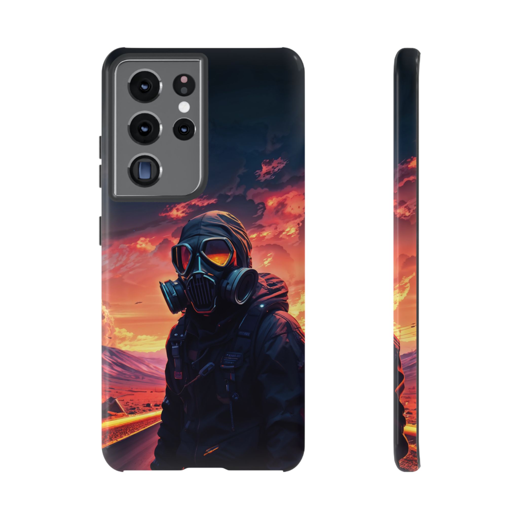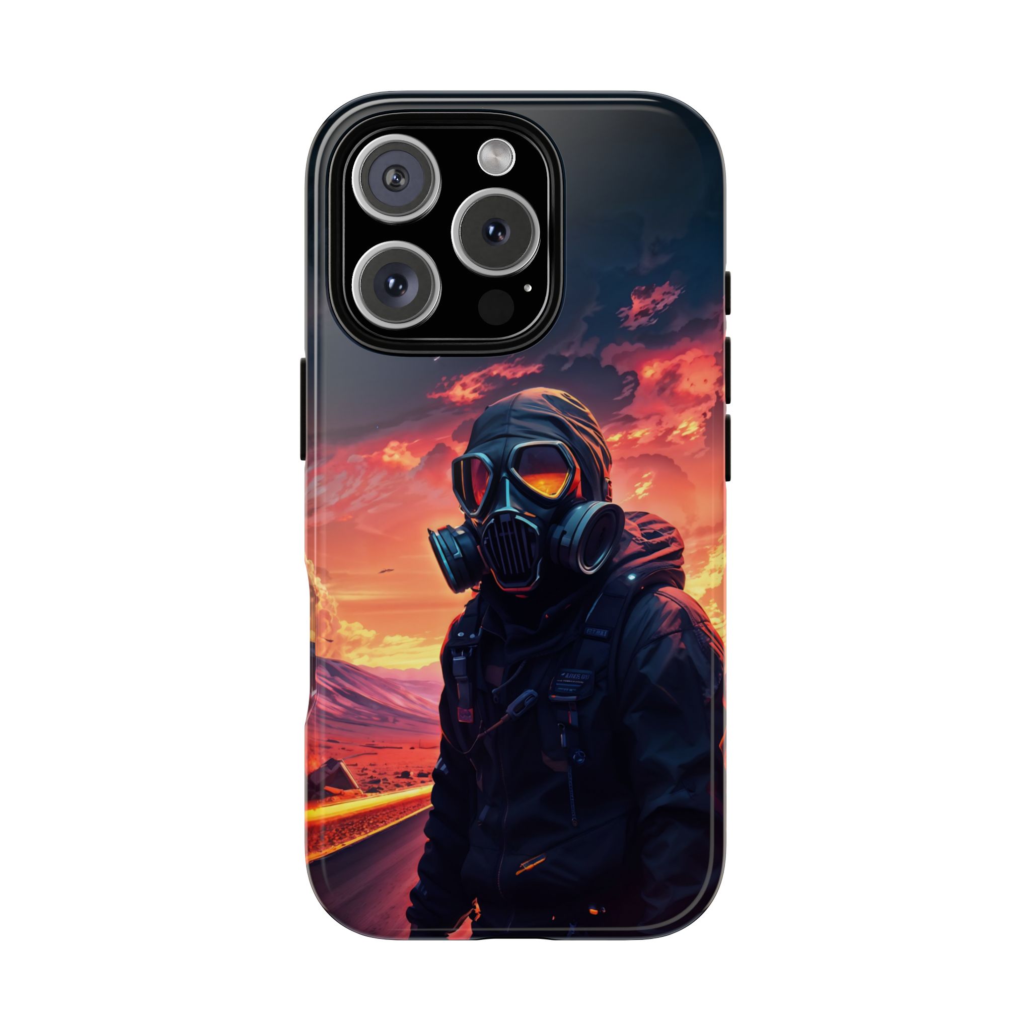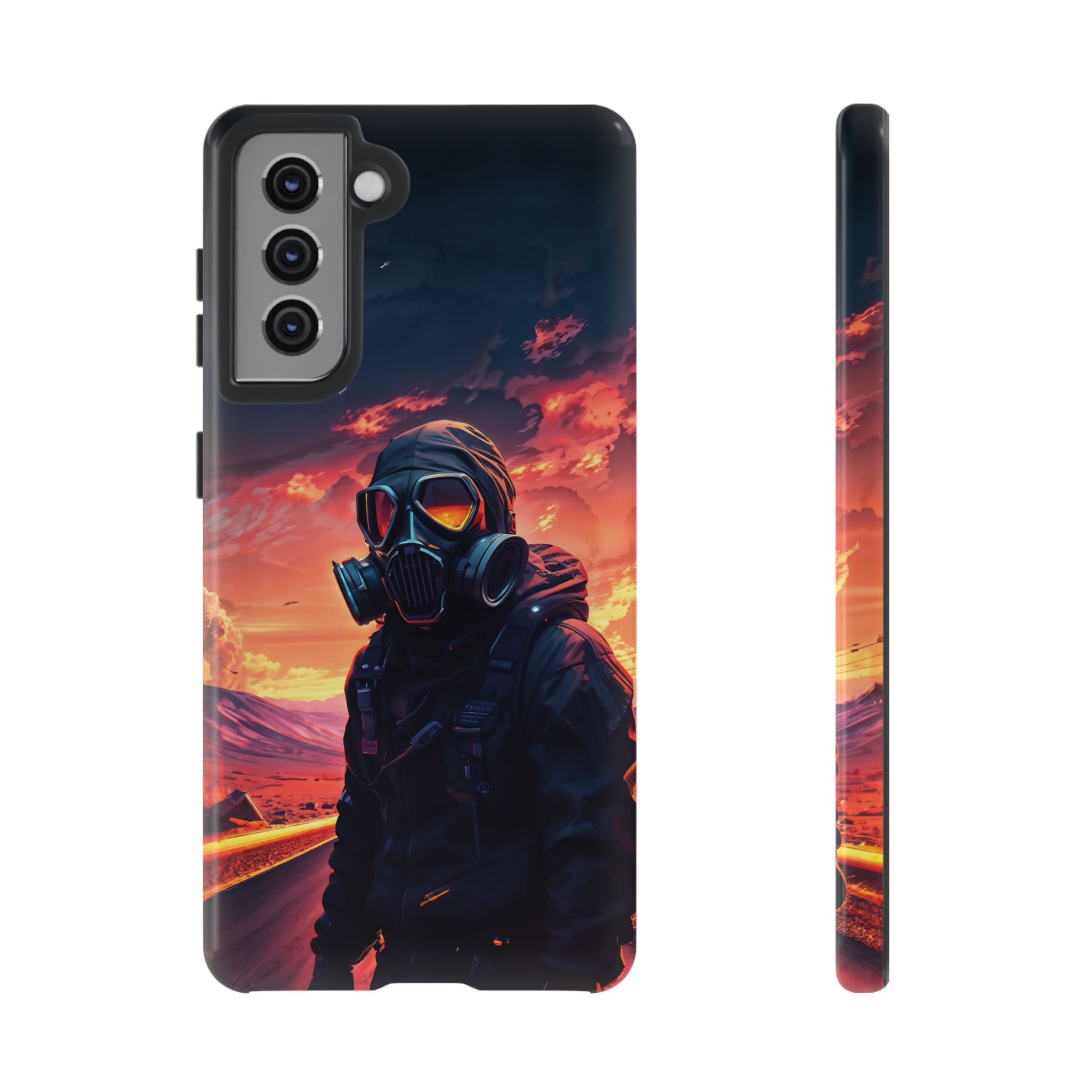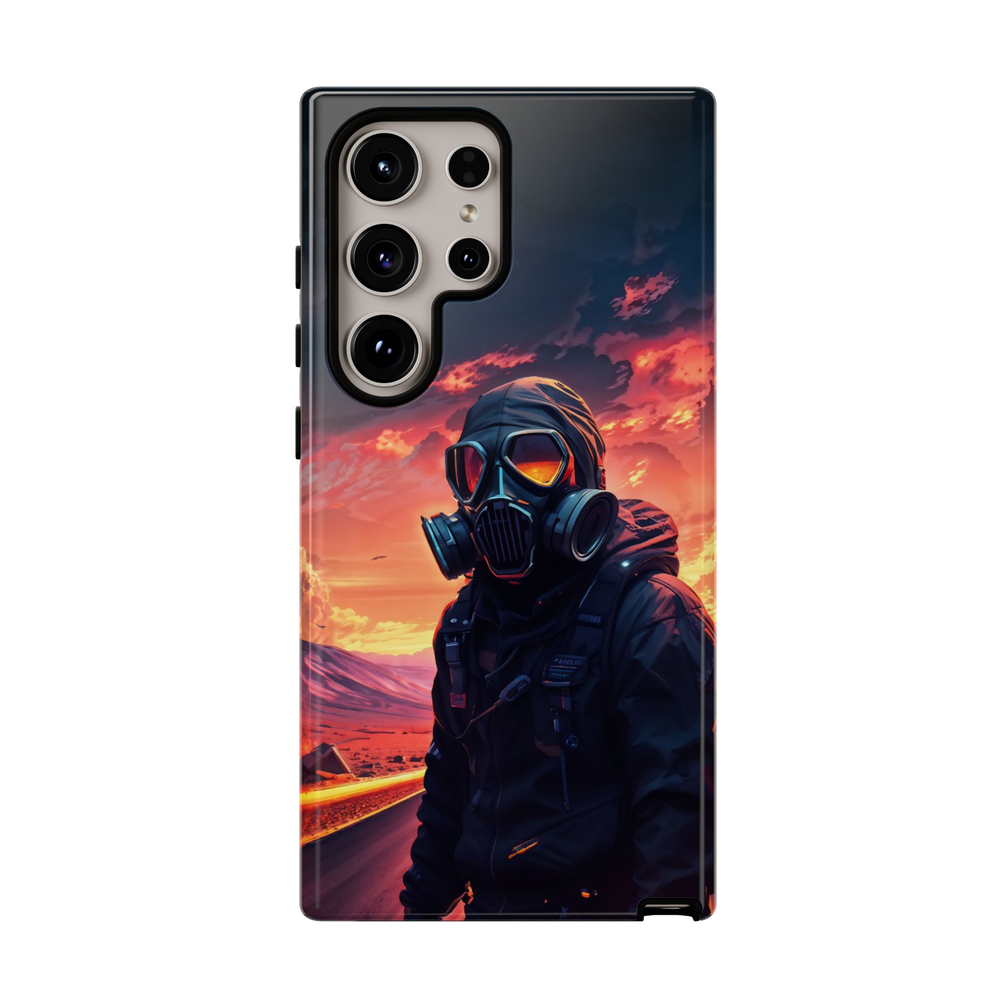 Prepare your device for the apocalypse—this rugged phone case merges high-impact protection with a hauntingly cinematic design. Featuring a lone survivor in a tactical exo-suit and futuristic gas mask, the artwork captures a moment of defiance on a scorched highway beneath a burning sky. Shades of molten orange, crimson, and violet stretch across the horizon, evoking themes of isolation, resilience, and post-apocalyptic beauty.