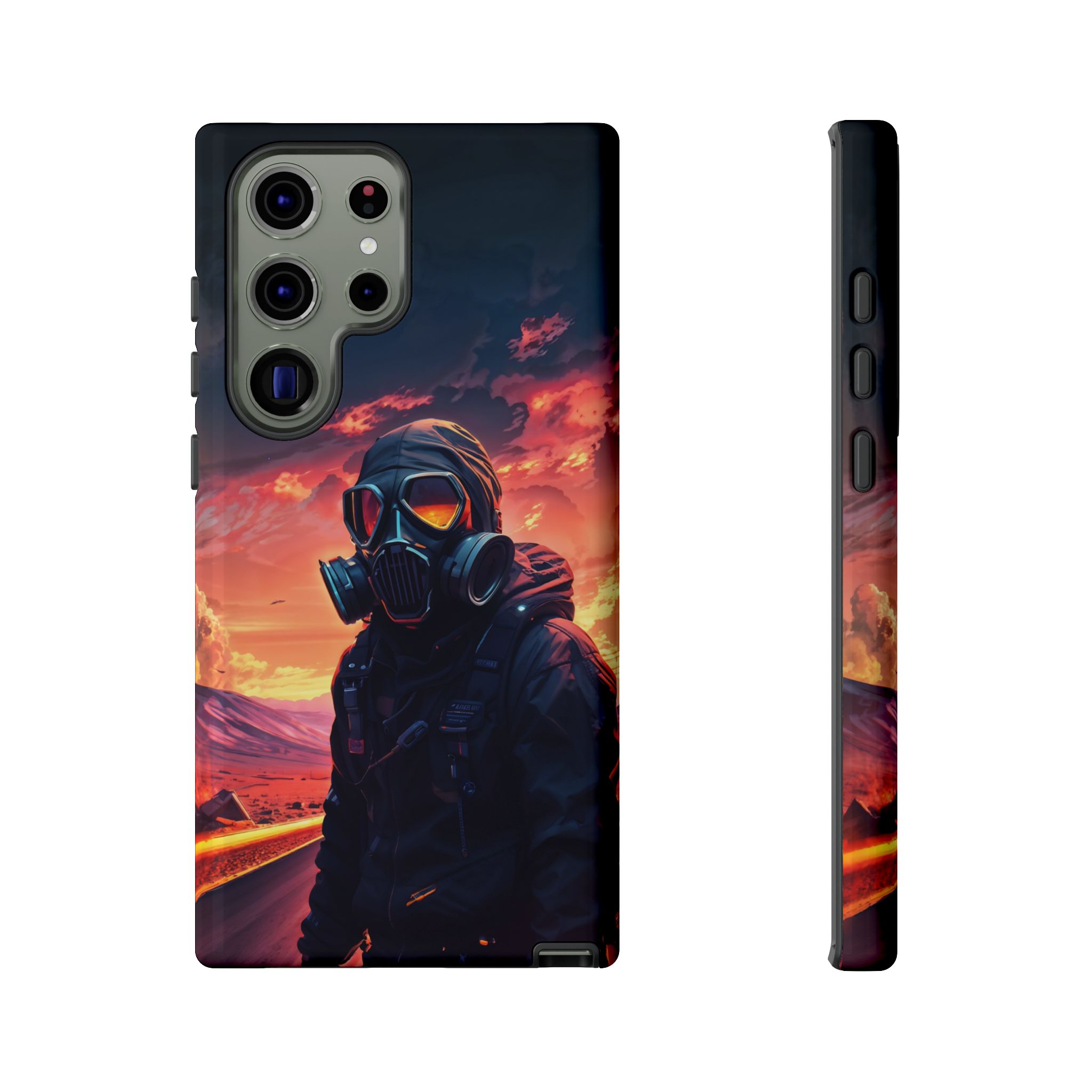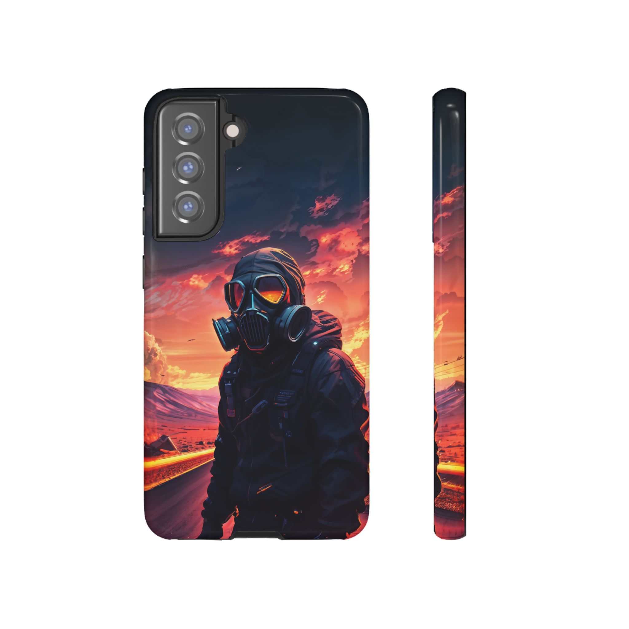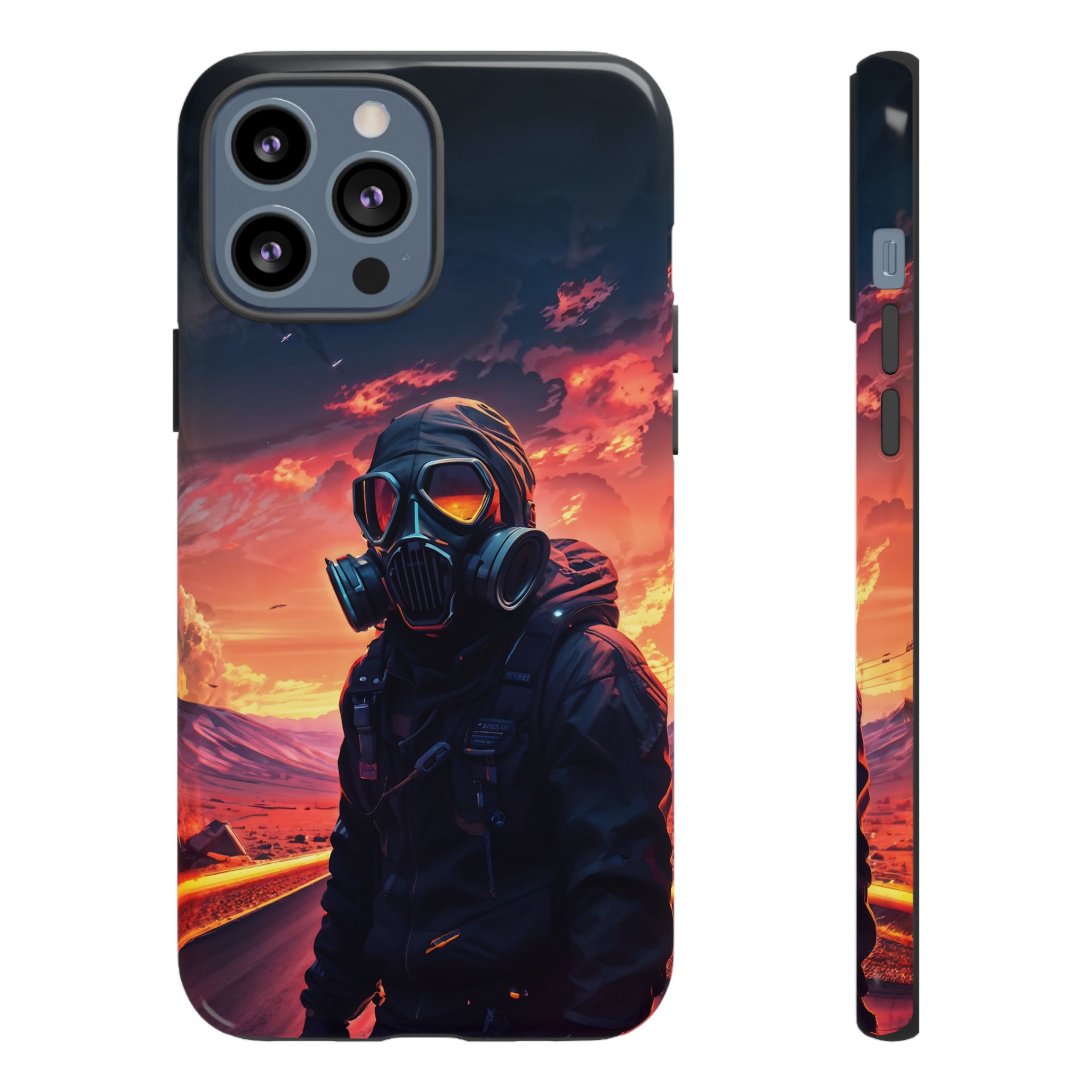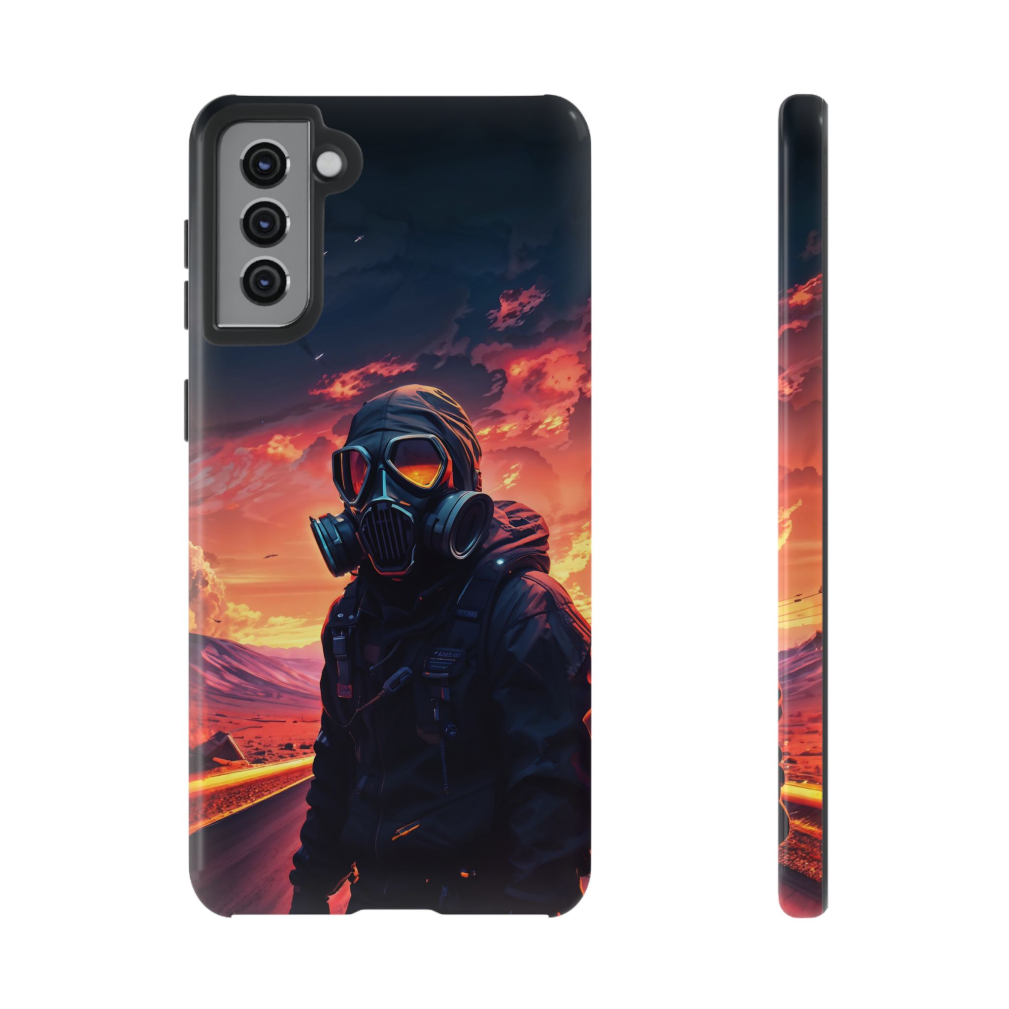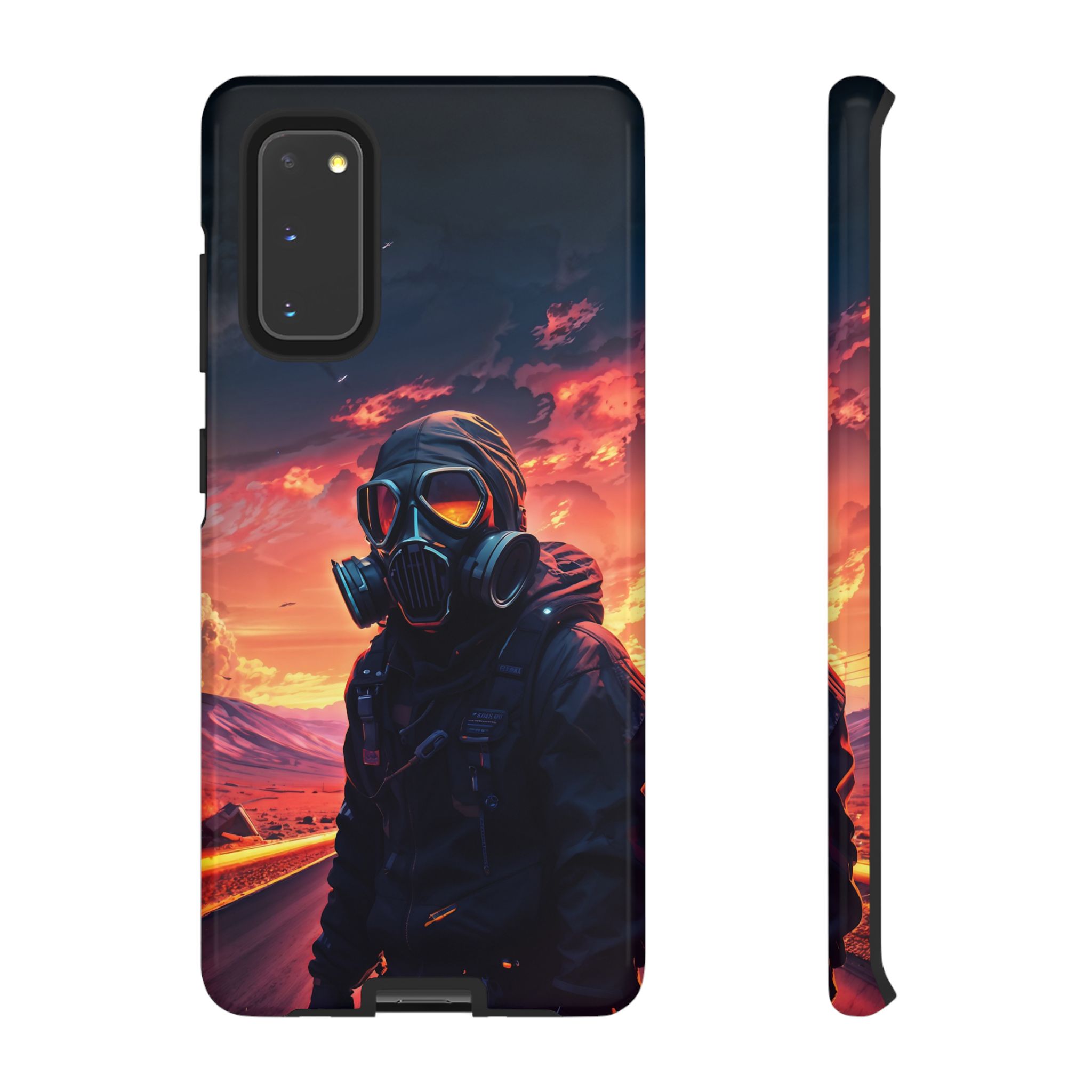 Prepare your device for the apocalypse—this rugged phone case merges high-impact protection with a hauntingly cinematic design. Featuring a lone survivor in a tactical exo-suit and futuristic gas mask, the artwork captures a moment of defiance on a scorched highway beneath a burning sky. Shades of molten orange, crimson, and violet stretch across the horizon, evoking themes of isolation, resilience, and post-apocalyptic beauty.