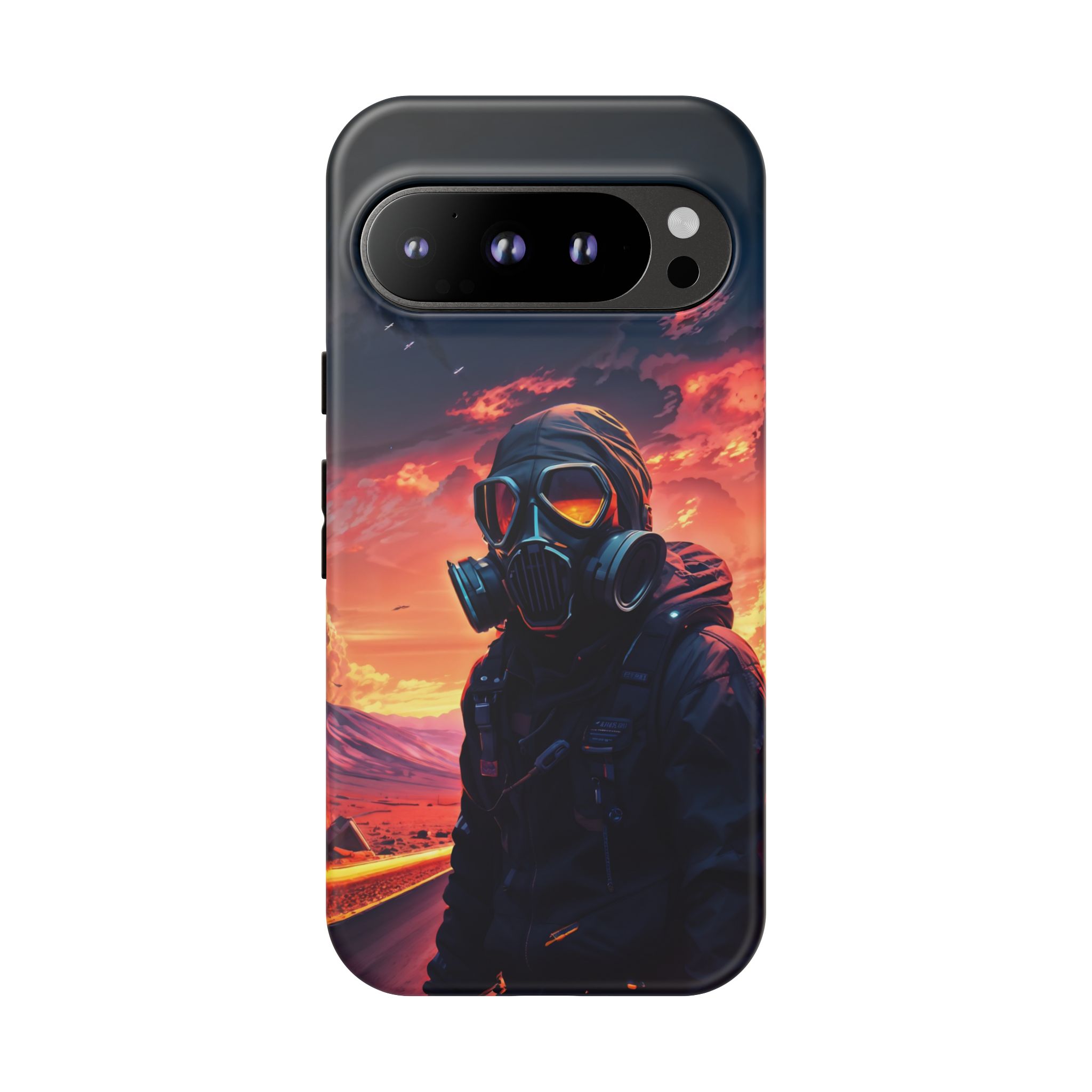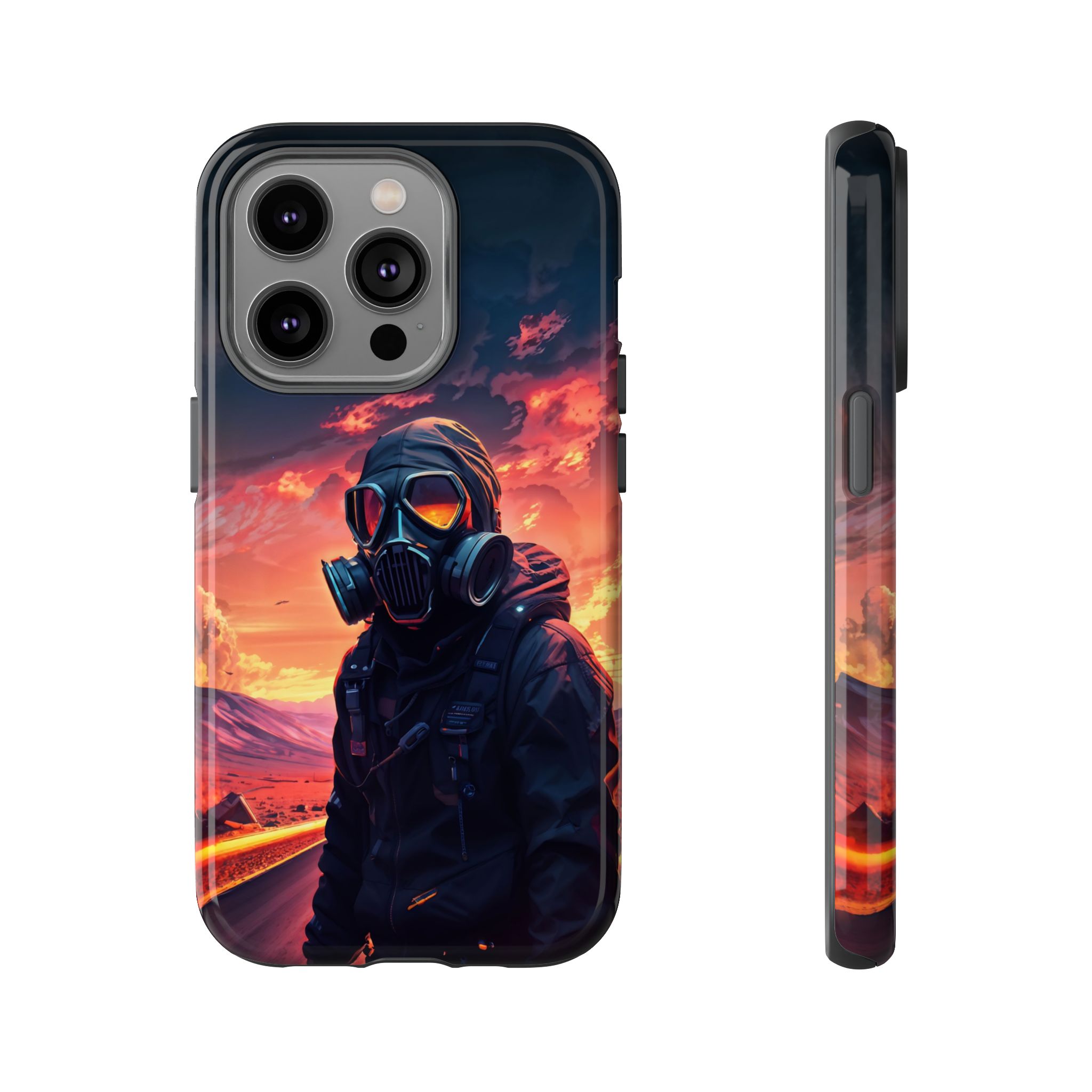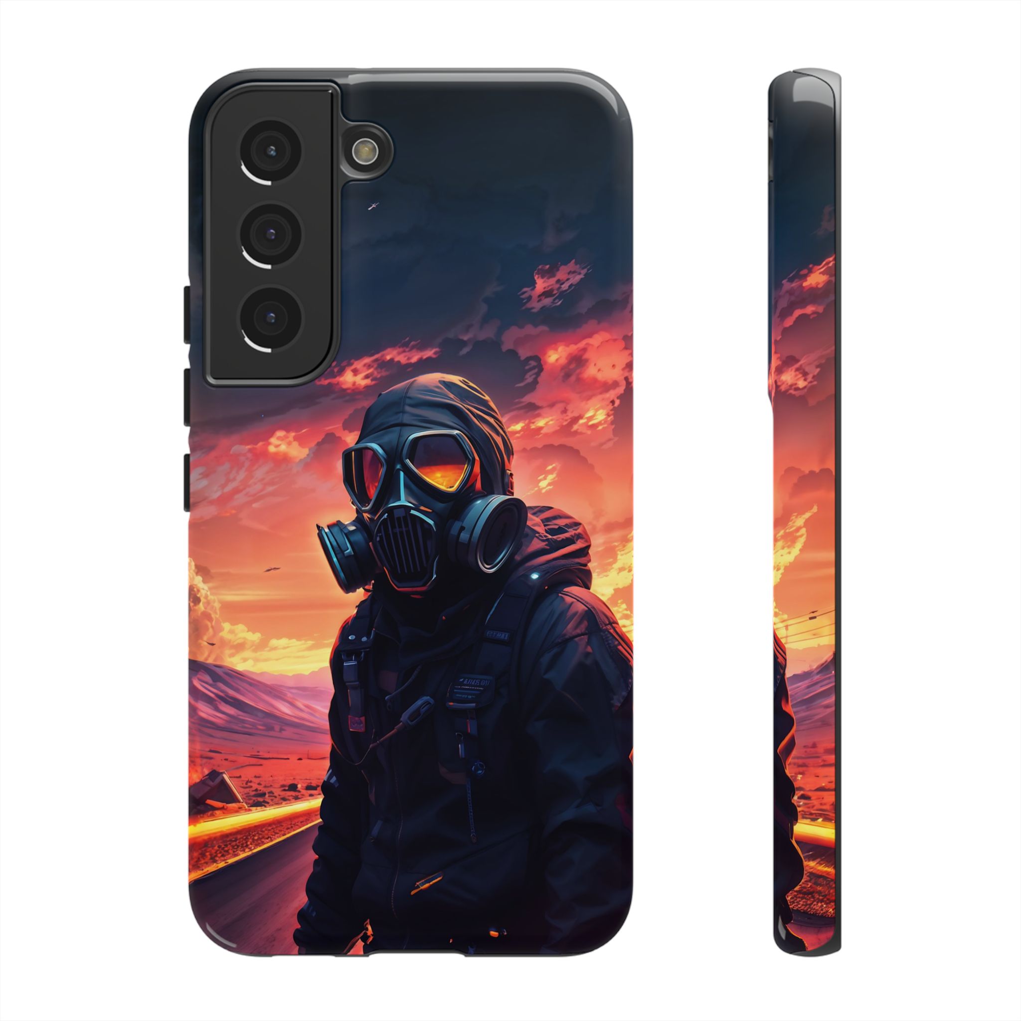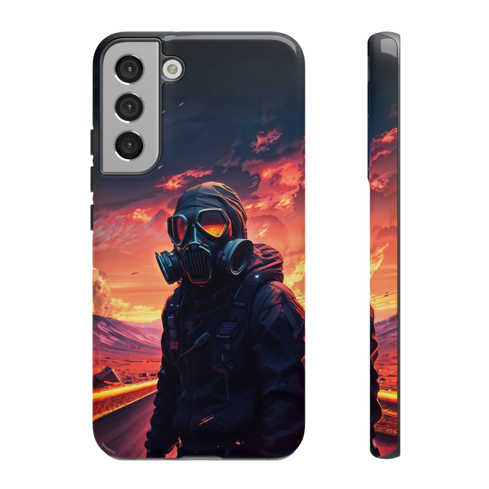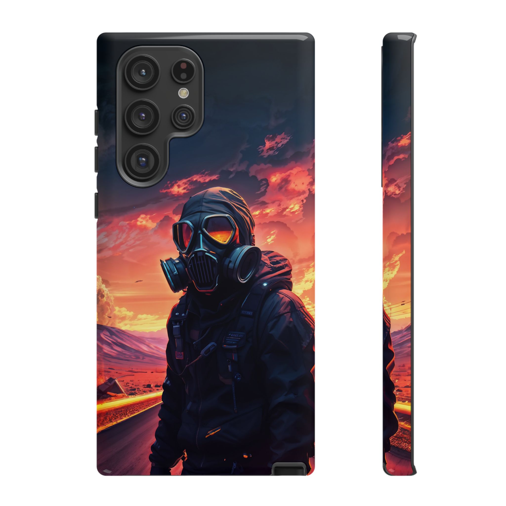 Prepare your device for the apocalypse—this rugged phone case merges high-impact protection with a hauntingly cinematic design. Featuring a lone survivor in a tactical exo-suit and futuristic gas mask, the artwork captures a moment of defiance on a scorched highway beneath a burning sky. Shades of molten orange, crimson, and violet stretch across the horizon, evoking themes of isolation, resilience, and post-apocalyptic beauty.