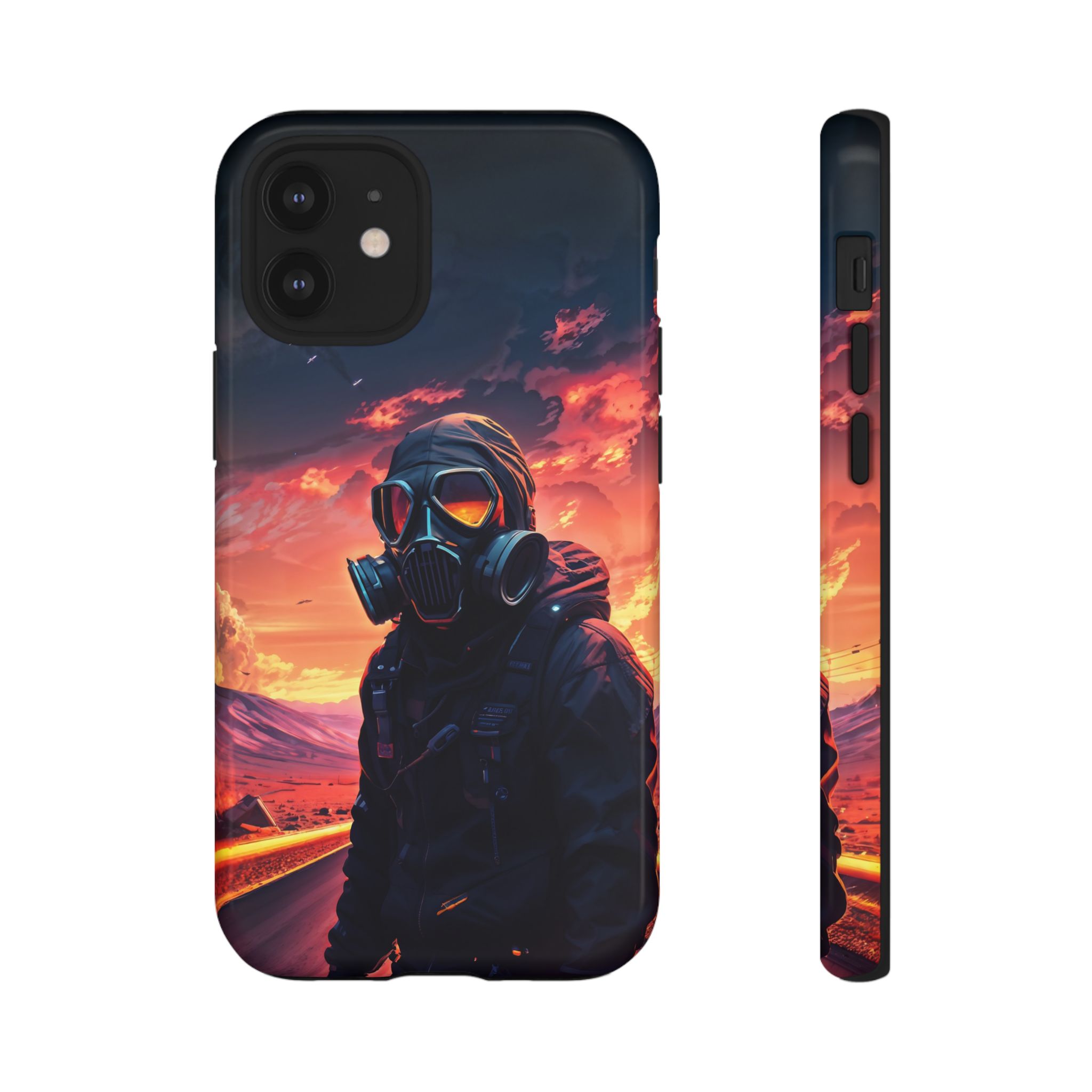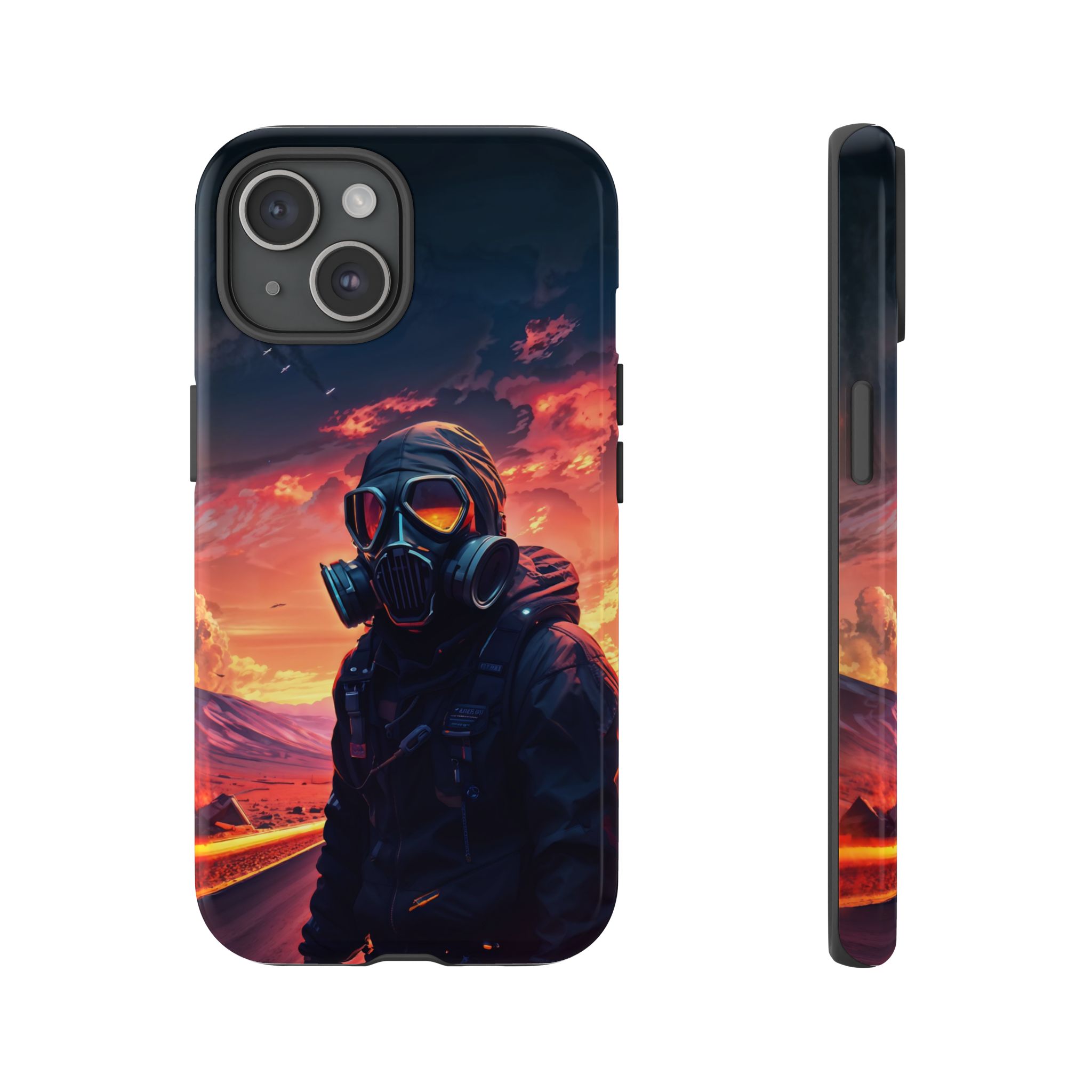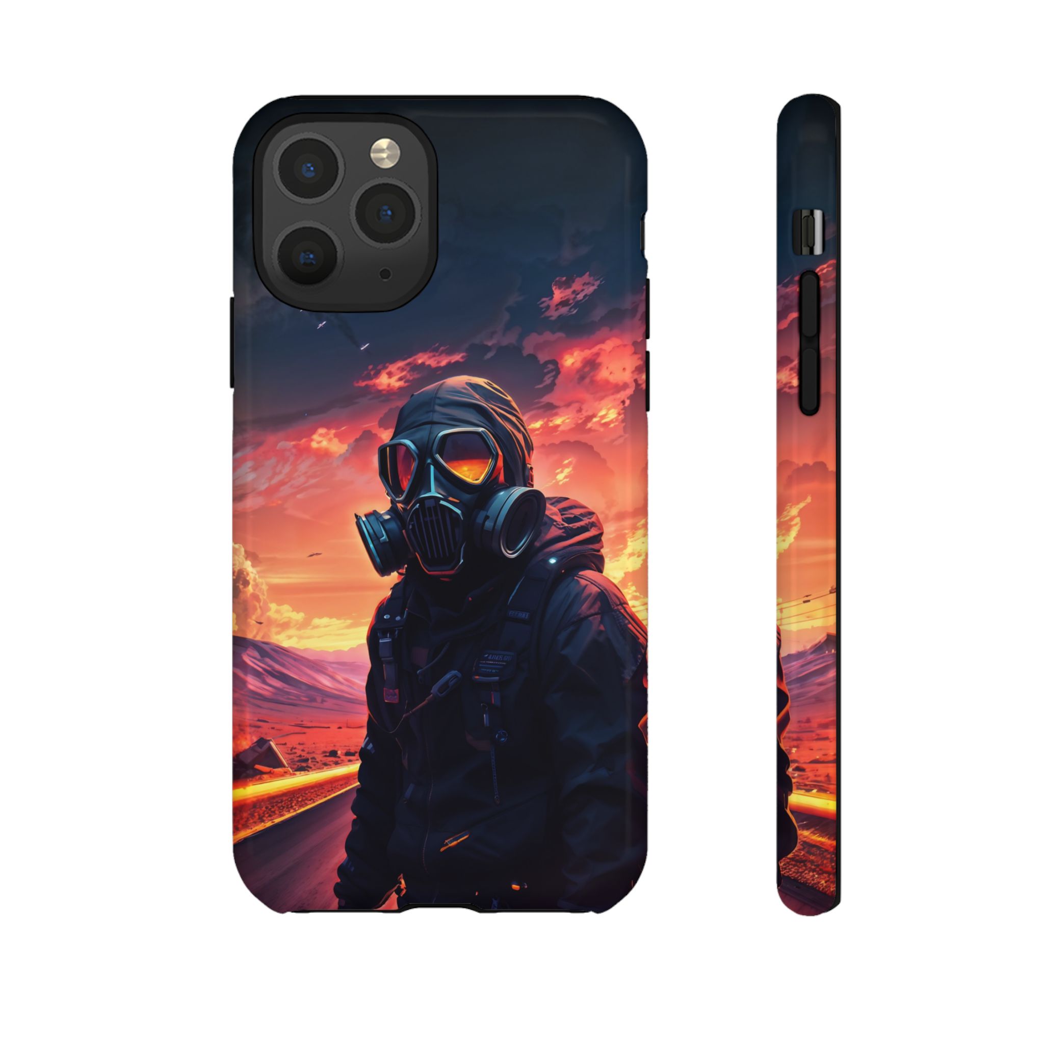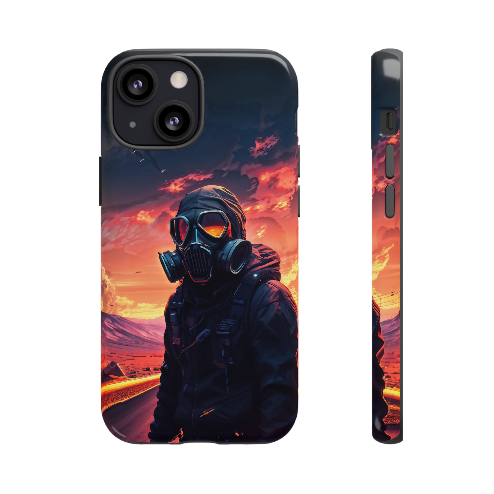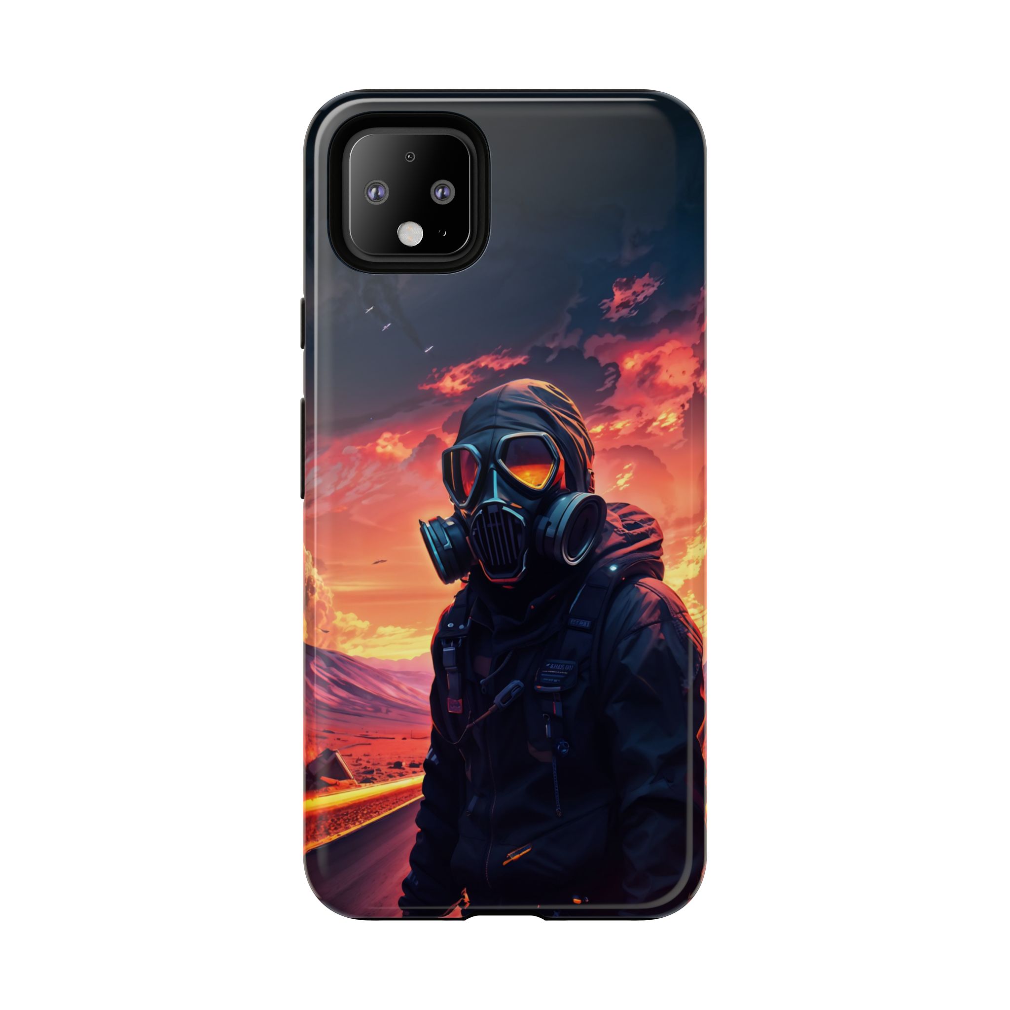 Prepare your device for the apocalypse—this rugged phone case merges high-impact protection with a hauntingly cinematic design. Featuring a lone survivor in a tactical exo-suit and futuristic gas mask, the artwork captures a moment of defiance on a scorched highway beneath a burning sky. Shades of molten orange, crimson, and violet stretch across the horizon, evoking themes of isolation, resilience, and post-apocalyptic beauty.