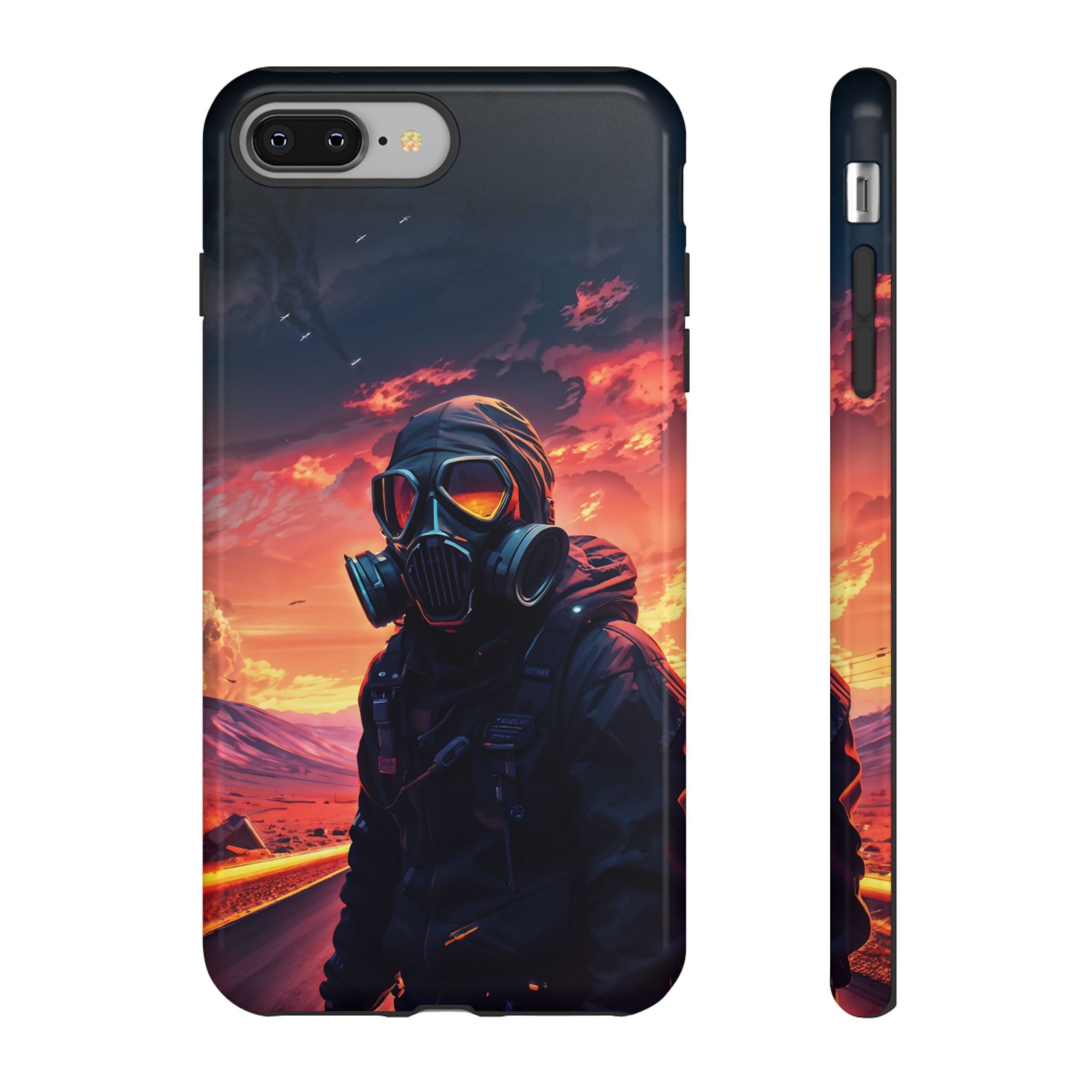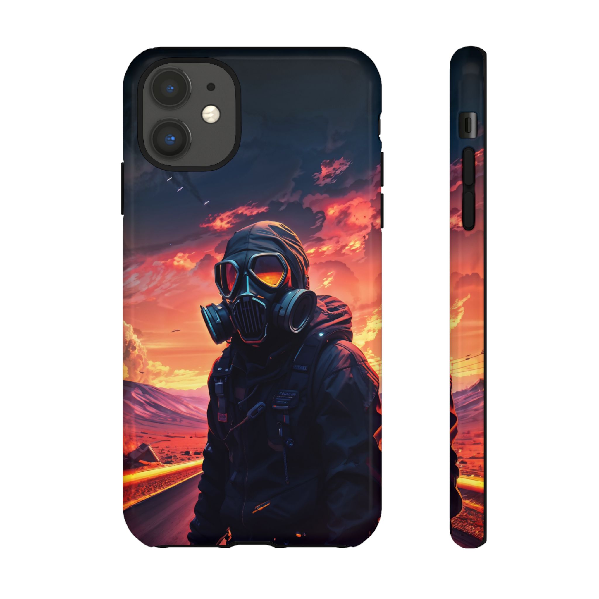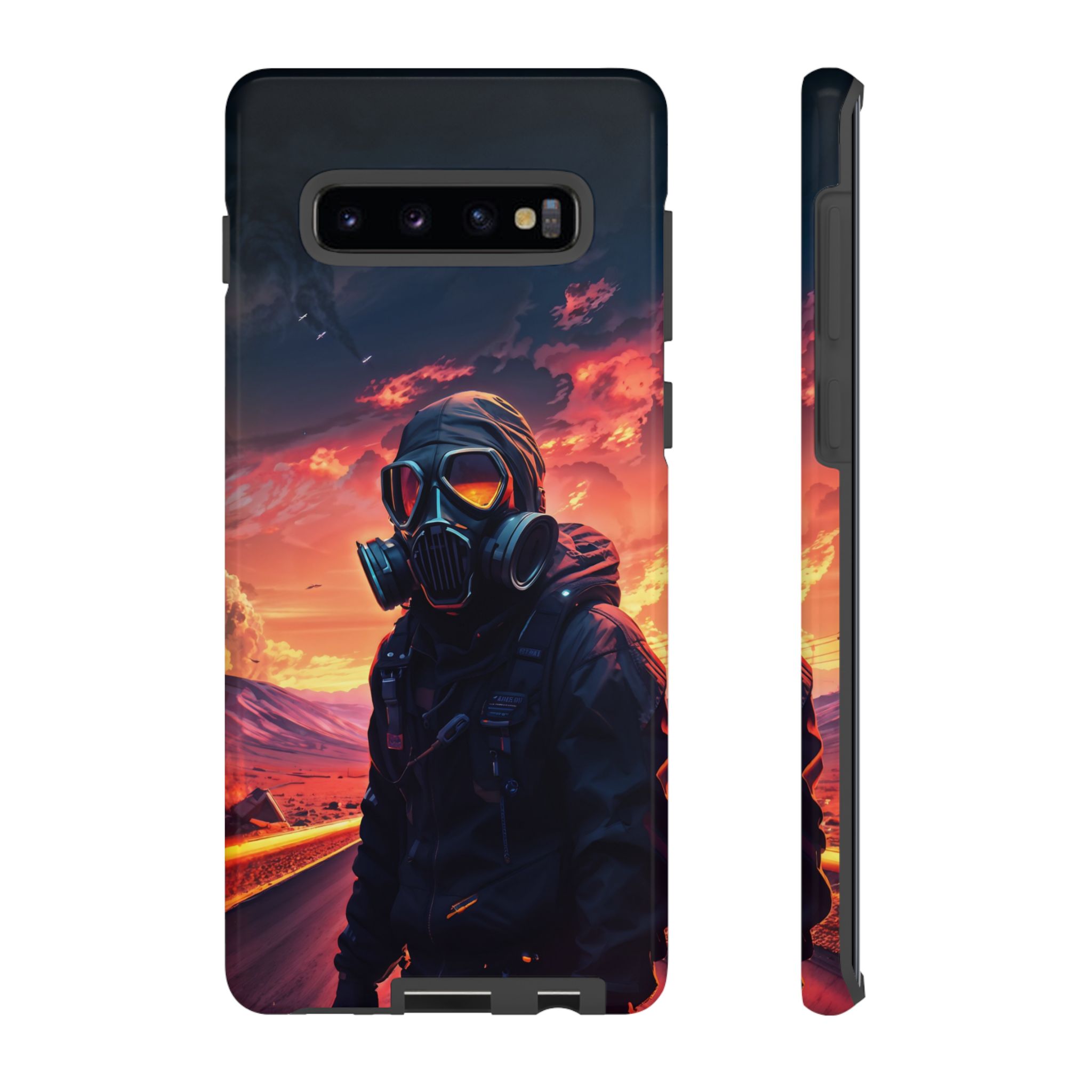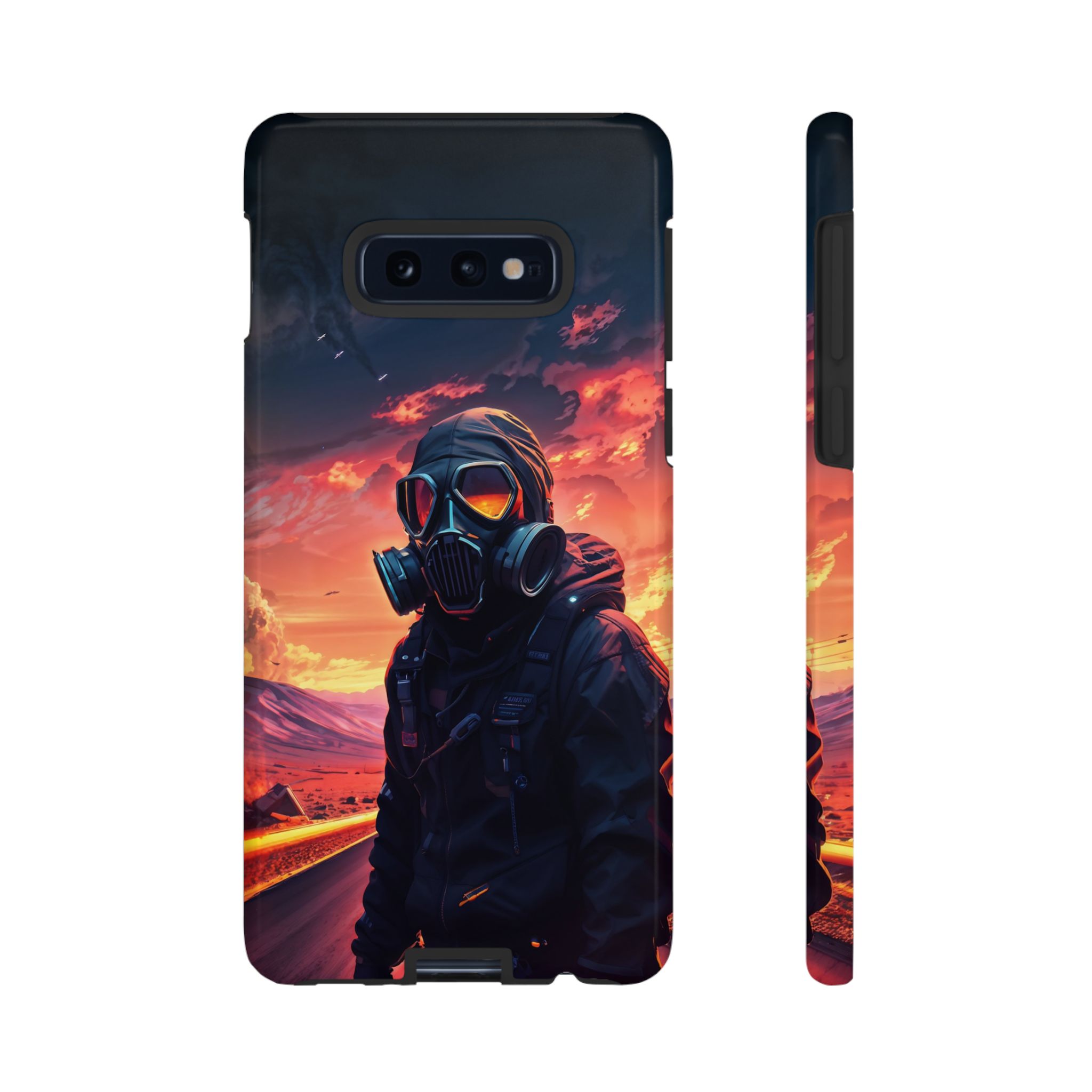 Prepare your device for the apocalypse—this rugged phone case merges high-impact protection with a hauntingly cinematic design. Featuring a lone survivor in a tactical exo-suit and futuristic gas mask, the artwork captures a moment of defiance on a scorched highway beneath a burning sky. Shades of molten orange, crimson, and violet stretch across the horizon, evoking themes of isolation, resilience, and post-apocalyptic beauty.