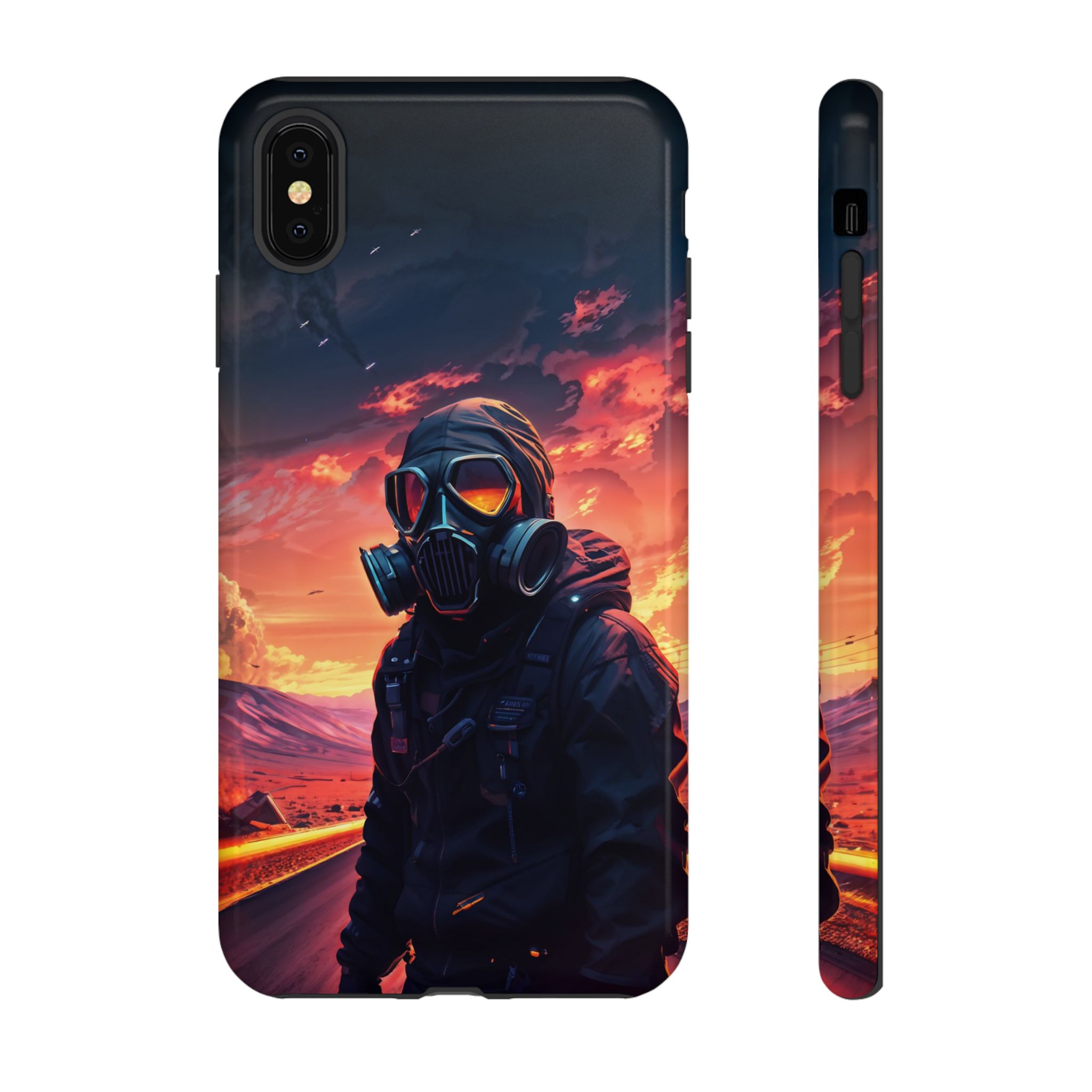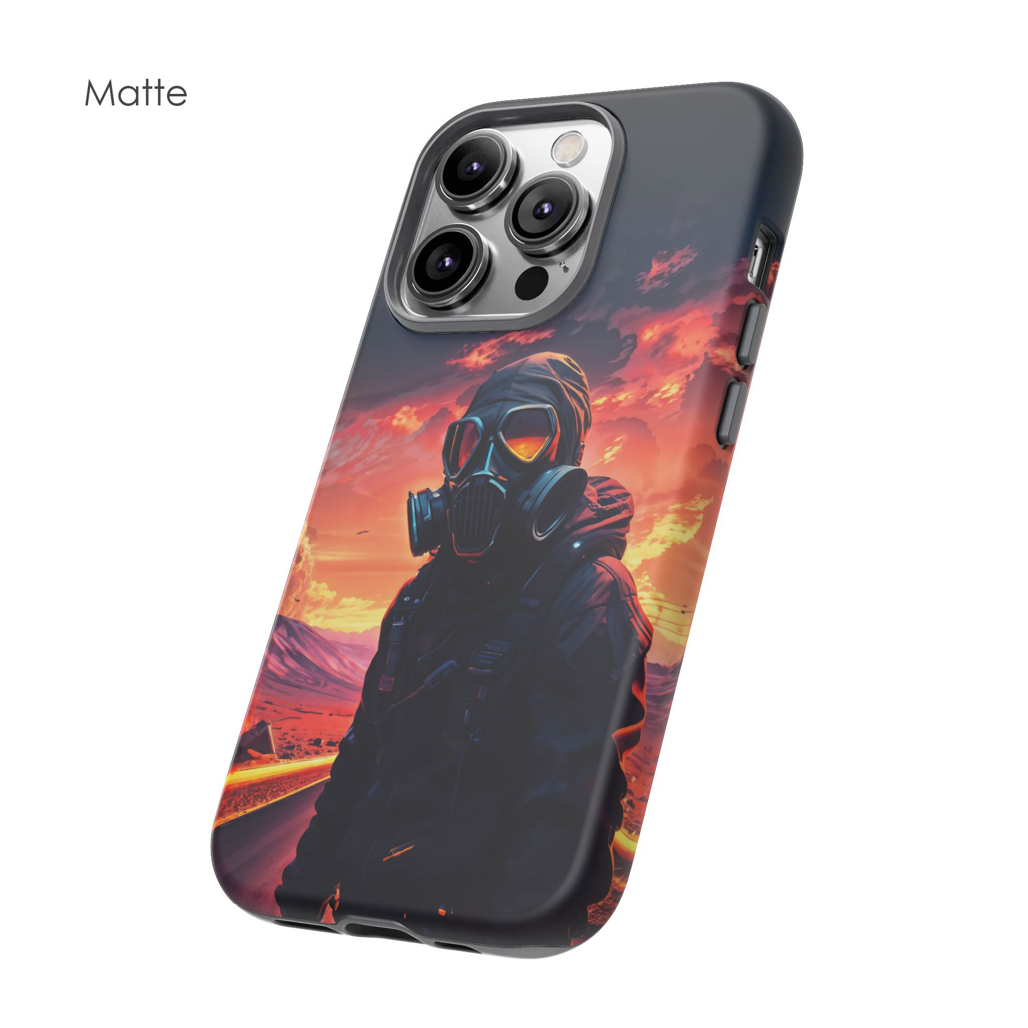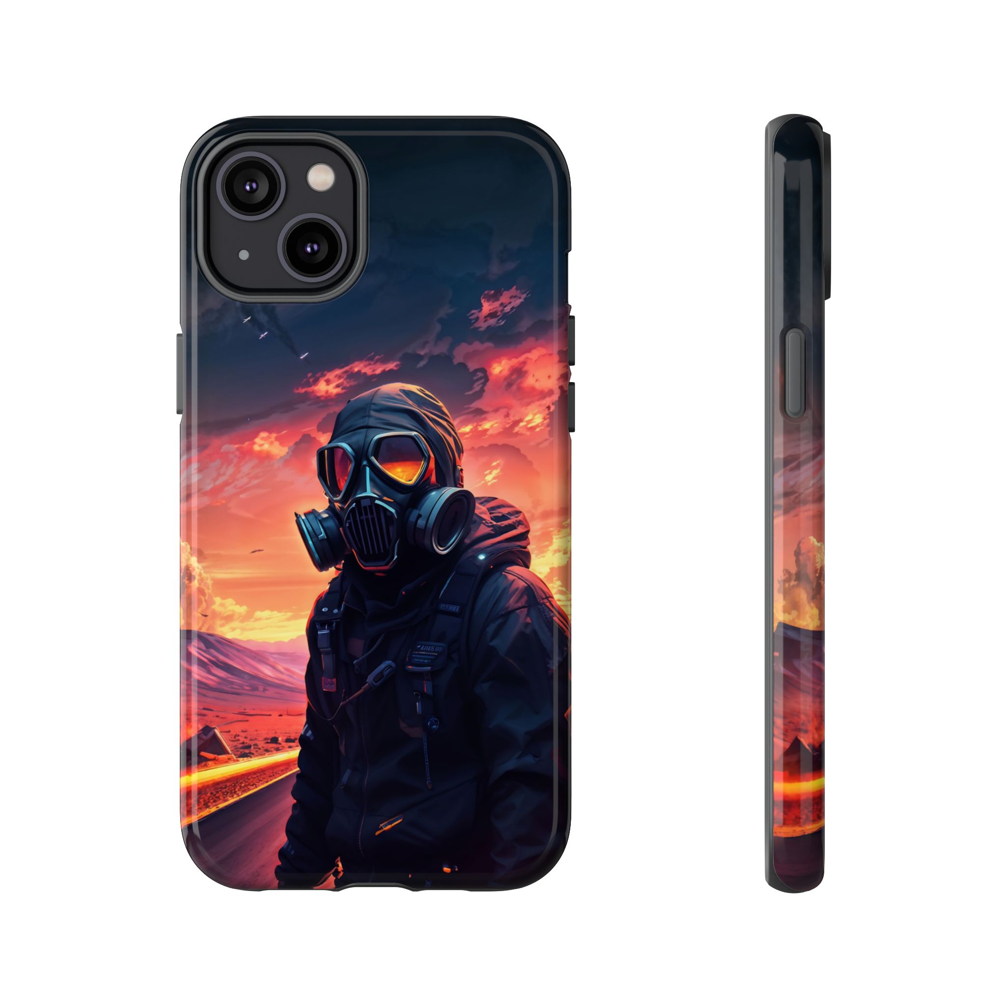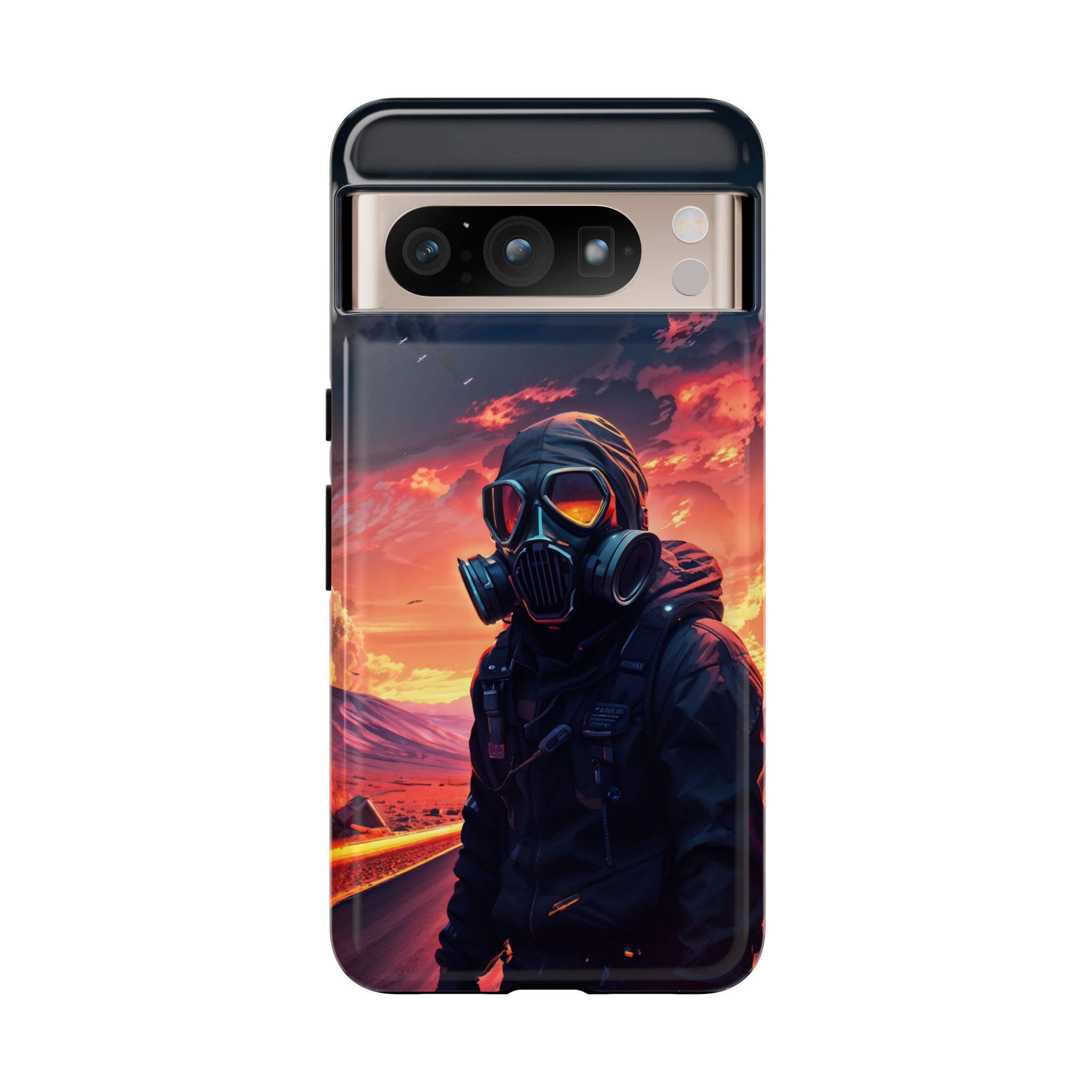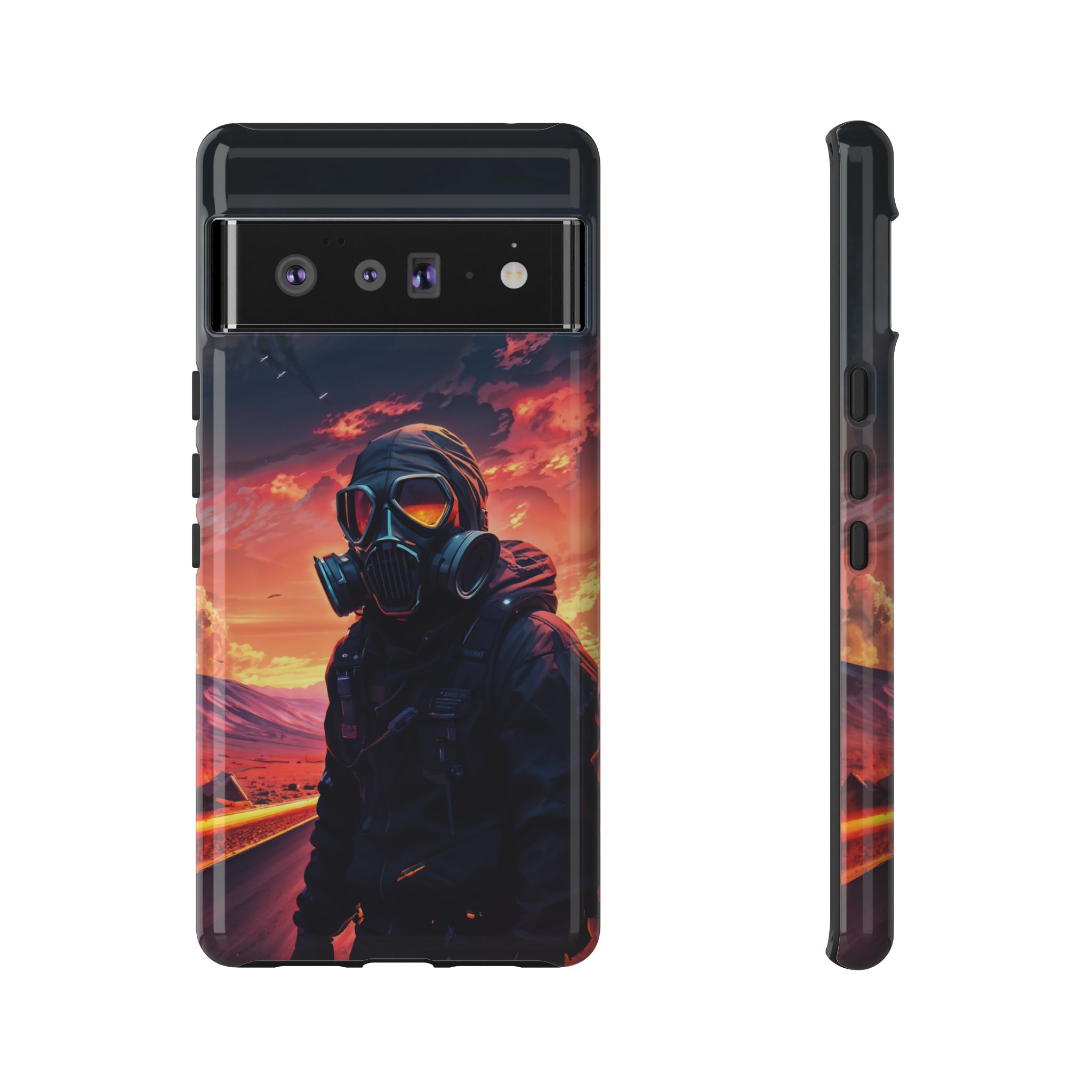 Prepare your device for the apocalypse—this rugged phone case merges high-impact protection with a hauntingly cinematic design. Featuring a lone survivor in a tactical exo-suit and futuristic gas mask, the artwork captures a moment of defiance on a scorched highway beneath a burning sky. Shades of molten orange, crimson, and violet stretch across the horizon, evoking themes of isolation, resilience, and post-apocalyptic beauty.